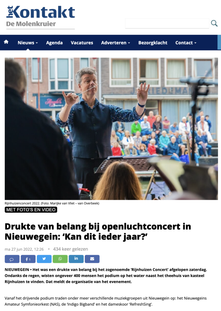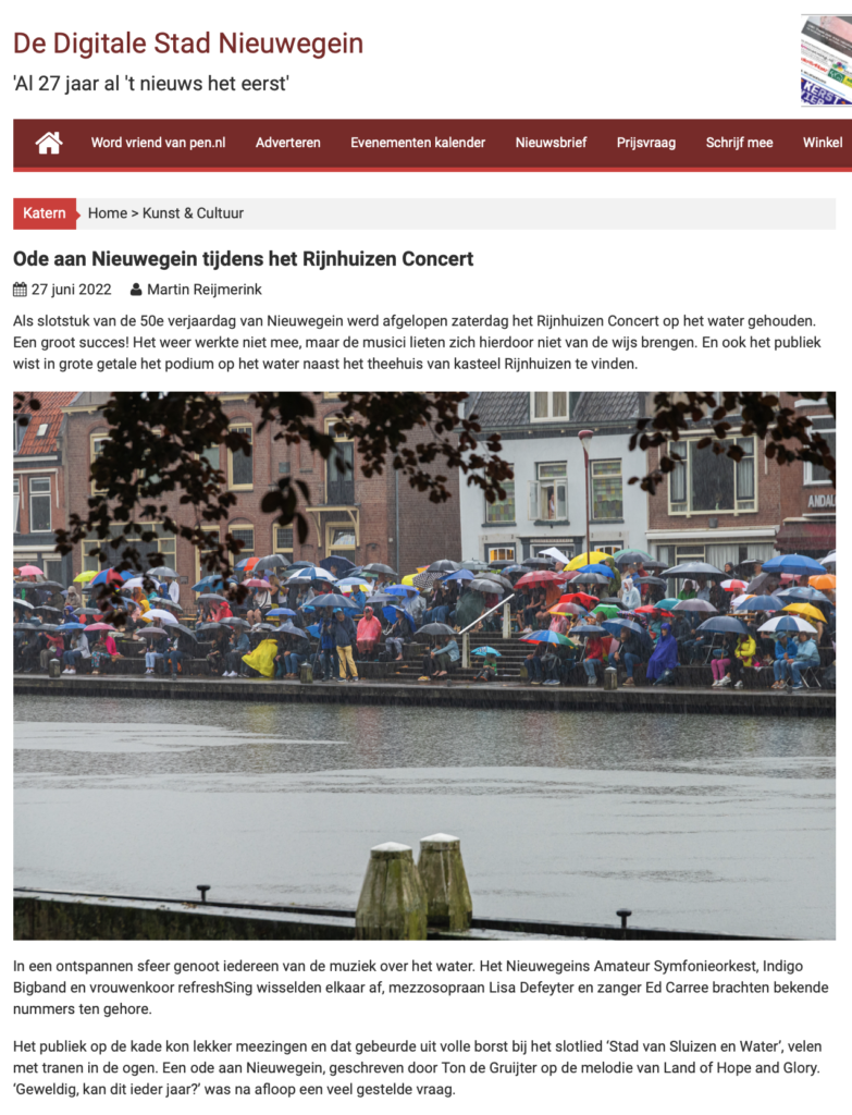 Zo fijn om te lezen hoe het concert werd gewaardeerd door het publiek. En wat waren we blij dat het publiek zich niet liet ontmoedigen door straffe regenbuien. Het Contact – De Molenkruier meldde Drukte van belang bij openluchtconcert in Nieuwegein: ‘Kan dit ieder jaar?’. PEN.nl gaf extra aandacht aan het door stadsdichter Ton de Gruijter geschreven slotlied in het artikel Ode aan Nieuwegein tijdens Rijnhuizen Concert.